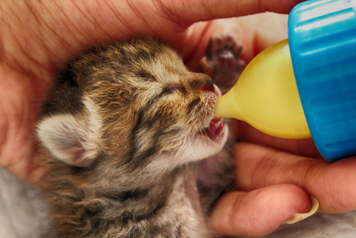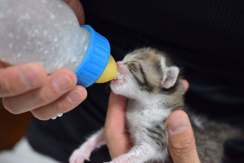 人肌ぐらいで温めたネコ用ミルクを哺乳瓶で与えます。